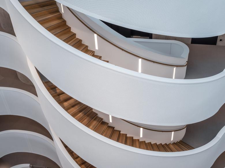 Auf einer Gesamtfläche von 7.200 m² spiegelt das Gebäude die Grundwerte des Unternehmens – Innovation, Offenheit und Nachhaltigkeit – wider. Klare, organische Formen und Tageslicht charakterisieren dabei den Innenraum mit einem zentralen Atrium, das sich über alle Geschosse erstreckt. Basierend auf den New-Work-Prinzipien fördern offene Arbeitsbereiche kreative Zusammenarbeit und den Austausch zwischen den Mitarbeitenden. Individuell gestaltete, geschlossene Bereichen bieten dabei Rückzugsmöglichkeiten und Raum für ungestörtes Arbeiten.