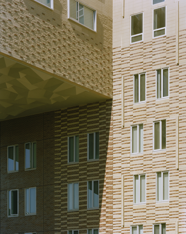 One Western Avenue occupies a prominent site at the southeast corner of the Harvard Business School, adjacent to the Charles River, where Western Avenue crosses Soldiers Field Road. The site marks arrival to Harvard’s campus from downtown Boston and areas south. The building’s configuration and image are based on interpretations of its physical context—the early-twentieth-century, five-story, brick-clad, U-shaped neo-Georgian courtyard houses and the mid-twentieth-century, twenty-story, concrete paneled modern towers. While One Western Avenue combines these two emblematic types, it adds something else, a three-story bridge raised four levels above the ground and spanning 180 feet. This volume divides the main central void into two contrasting spaces, a courtyard (with framed views to the river) and a front lawn. It creates a large covered terrace, furnished with a wooden platform intended for everyday use as well as special occasions. This configuration produces desirable conditions that normally exclude one another: a courtyard open to the river and three stories of apartments occupying the same riverfront situation. The low-rise is wrapped in two brick patterns, one for the exterior walls and the other for the interior walls. These overlap in the entry passageway, producing a third pattern. The mid-rise and the bridge are clad in cast stone blocks, but used differently from one another. The surface treatment of all of the volumes is designed to allow the ideal prismatic geometry of the various building masses to register on the façade planes. One of the first buildings designed to fulfill a new sustainability initiative at Harvard, known as “The Greening of the Crimson,” the project has recently received a silver LEED rating.