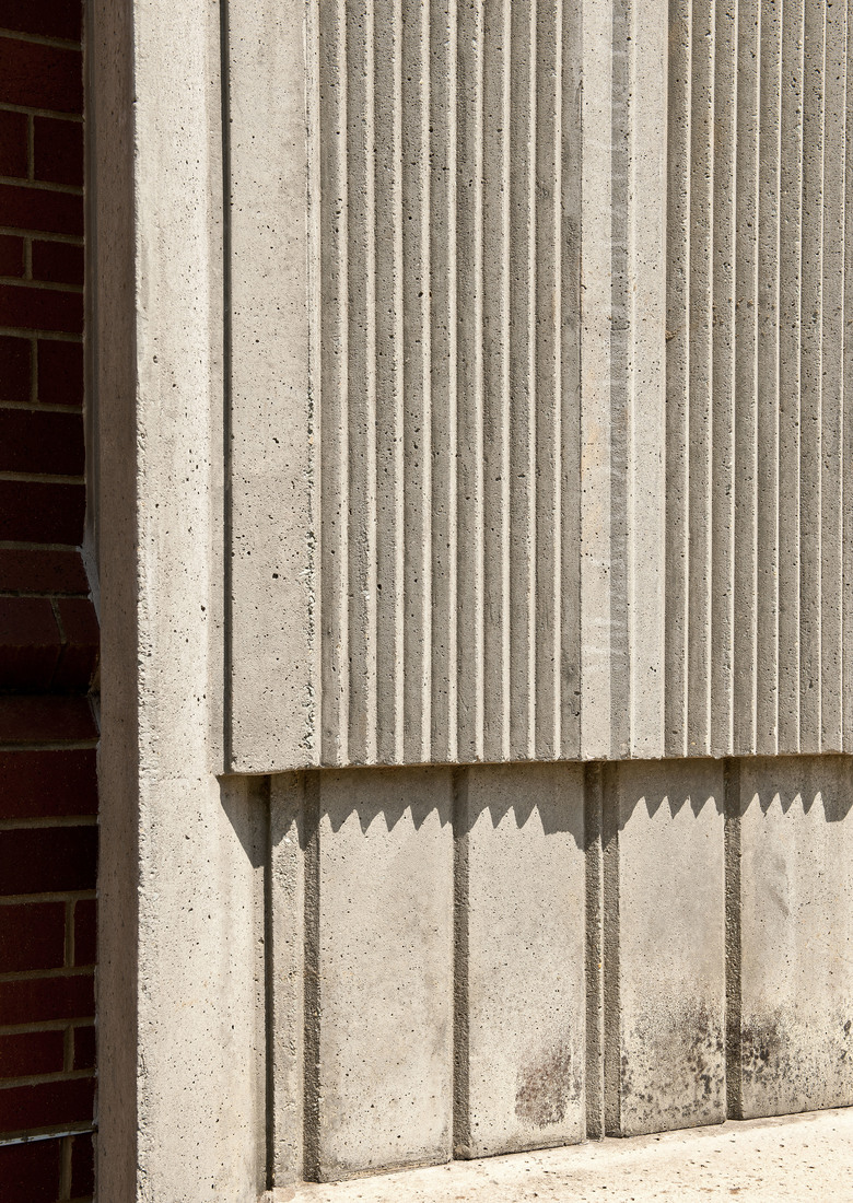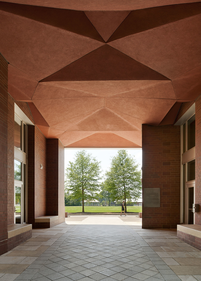 To the north, the three-story volume defines and reinforces an important pedestrian pathway that connects the east and west campuses. Articulated as a more irregular volume, this portion of the building conforms to the existing historic fabric in scale and articulation. On the southern edge along the playing fields, Scully Hall presents a more contemporary and larger scaled four-story face. This face provides a memorable campus front and a dramatic backdrop for the events that will take place in the elliptical fields. At the façade’s center, a gateway functions as the primary threshold to the fields, flanked by a tower that terminates the pedestrian sequence from the north.