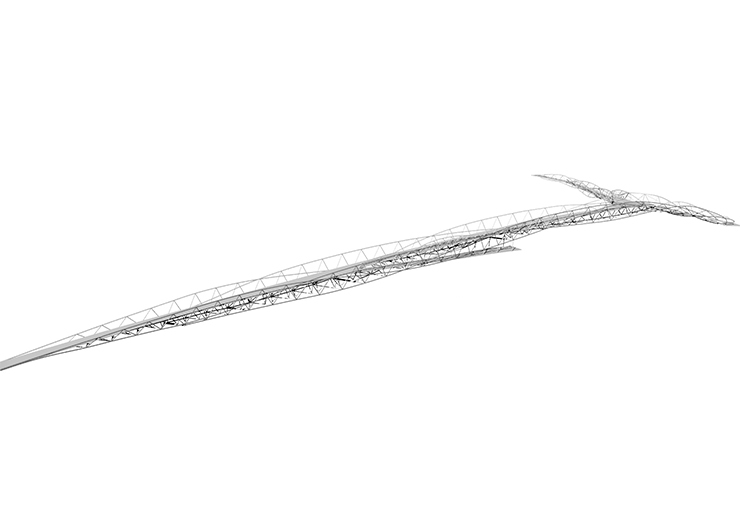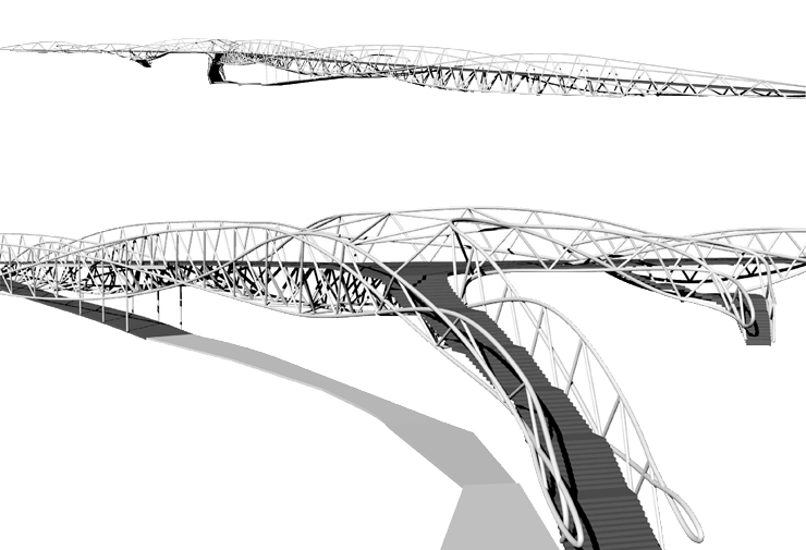 The new connection to Rubi's neighborhood Can Fratjó goes beyond replacing the current crosswalk of the stream, due a narrow passage on the same level as the train tracks, so it becomes a remarkable urban improvement of the environment through the barriers and residual spaces supression generated by the current port. The new footbridge arises from two variable winding shaped latticeworks that wants to archive a powerful unitary effect that makes it float between the two edges. It elapses independently from the current footbridge, as a link between different geographic levels solving all the connection levels.