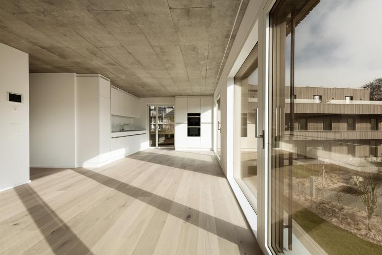 Auf zwei Geschossen und einem jeweils zusätzlichen Attikageschoss entwickeln die insgesamt acht Eigentumseinheiten luftige, lichtdurchflutete Wohnwelten – diese zeichnen sich allesamt durch grosszügige, fliessende Wohn- und Essbereiche aus sowie eigene Sichtbezüge und Verknüpfungen zum Aussenraum. Aus dieser komplexen Anforderung haben sich die vielschichtigen Grundrisse hergeleitet, welche von der durchlaufenden Balkonschicht gegliedert werden.
