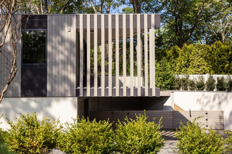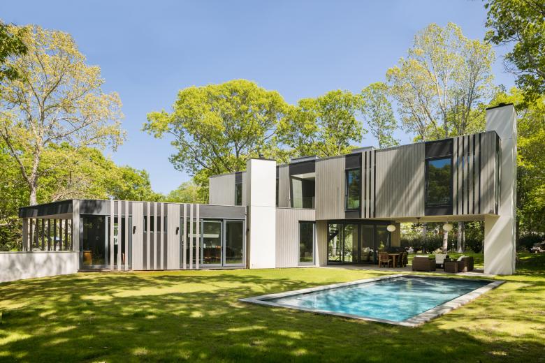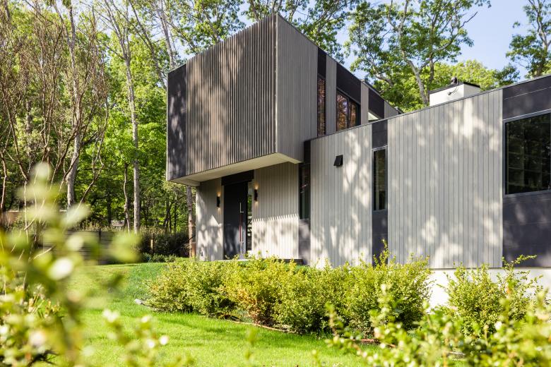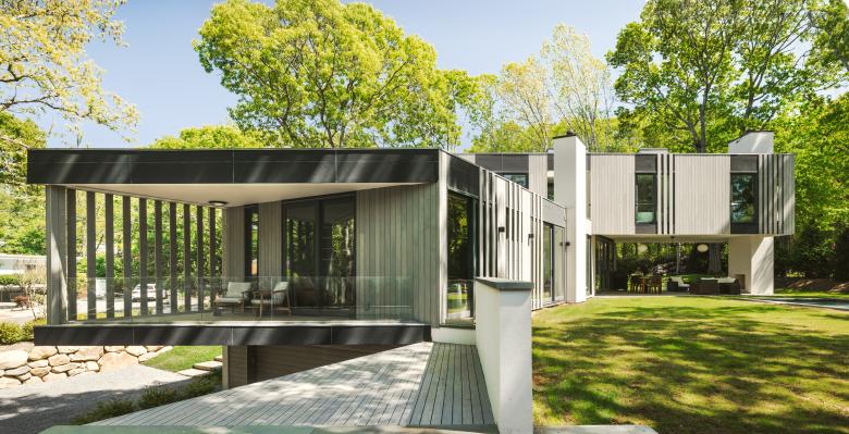 Perched on a sloping hill in Sag Harbor's historic SANS community, our Azurest Legacy project integrates latent passive technology while harmonizing with the environment. Stacked parallelograms make efficient use of the tight corner site, their rhythm responding to the natural qualities of the landscape. This effect of dynamic rising gives the building a celebratory air; a link between the treasured history of the neighborhood and the energy of new design.