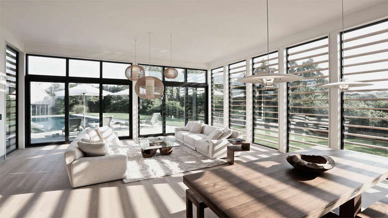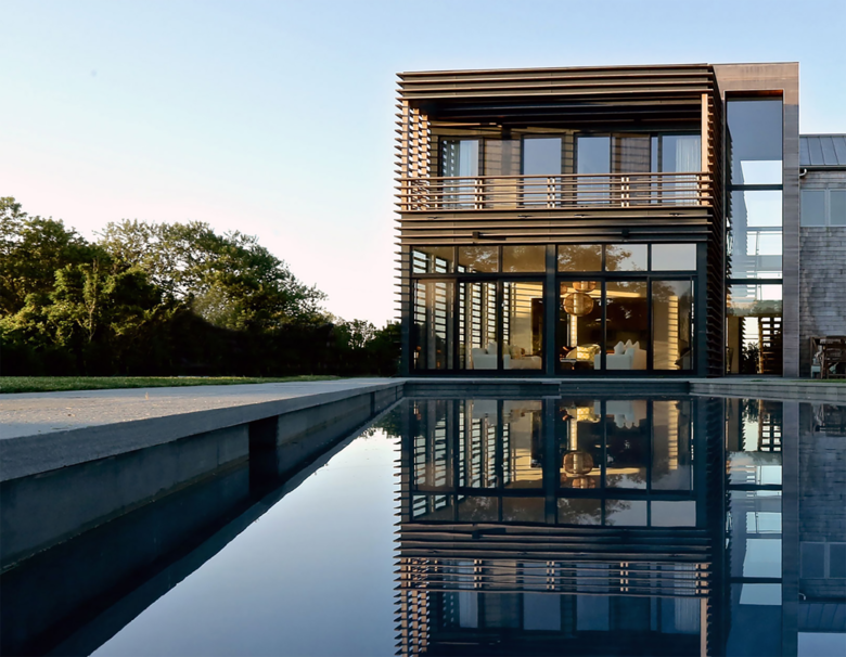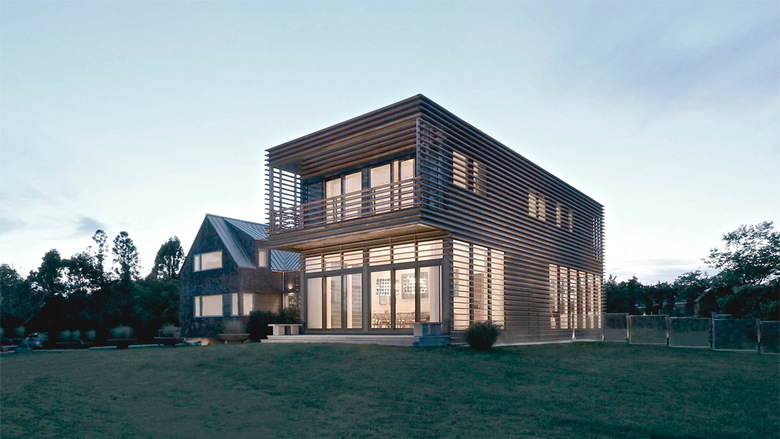 Horizontal cedar louvers wrap the modern box to provide solar shading, privacy, hurricane impact resistance, and results in a textured appearance displaying diverse effects during night and day. The decision to wrap the glass box addition achieves several objectives: matching the cedar materials of the existing house, controlling passive solar screening, privacy, and hurricane code compliance. Whereas the private rear garden provides a complex landscape of varied activity spaces, topographies, materials, decks, patios, and structures; the front lawn extends visually to the street as an uncomplicated field unscreened from public view and consistent with the character of East-end farmlands.