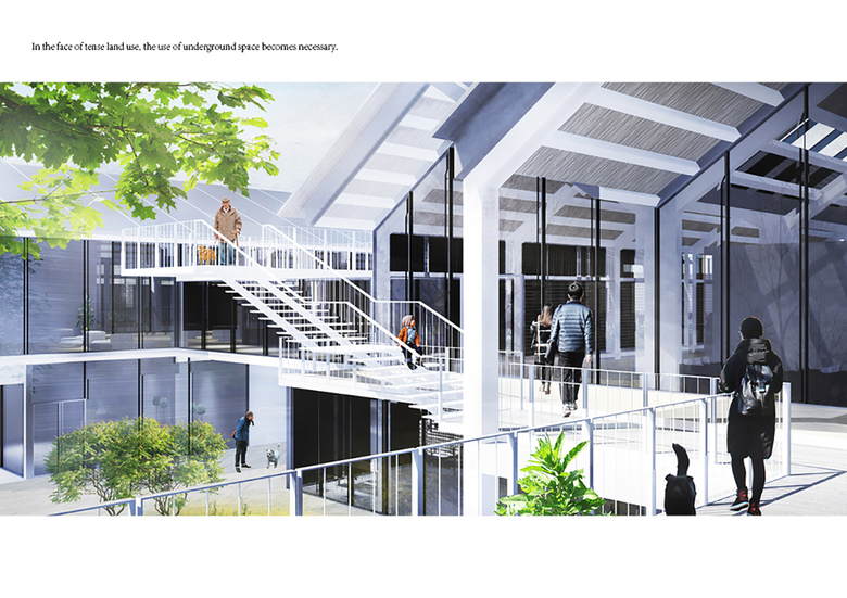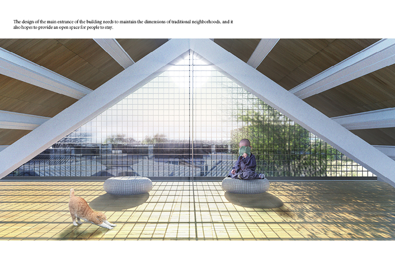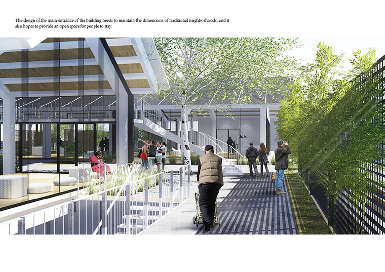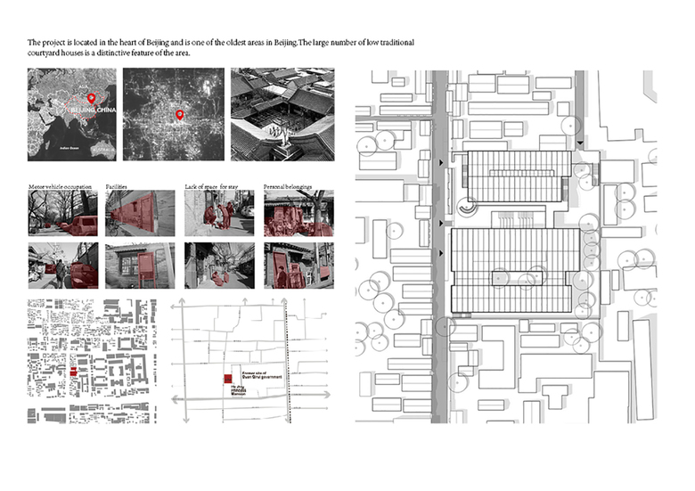The project is located in the heart of Beijing. There exist the famous Beijing’s courtyard houses, Hutongs and historical places. The accumulation of foreign low-income groups changed the life here. Crowded Hutongs and a lot of low-rise dwellings mixed with the unauthorized buildings became distinctive features of the area.Local residents urgently need more space for public activities. The mission is to build a community activity center for the surrounding community. Bold changes were made on the two buildings that exceeded the height limit of about 200%. The proposal is not to build a city landmark, but to inherit traditions so as to live in harmony with traditional buildings.