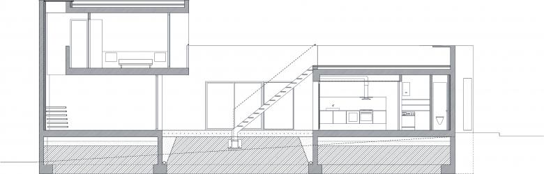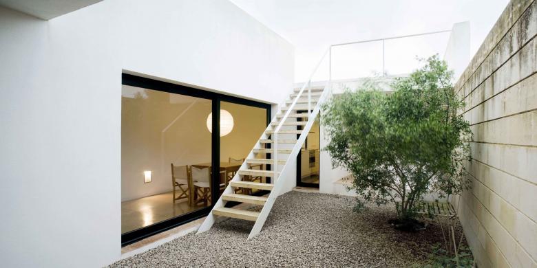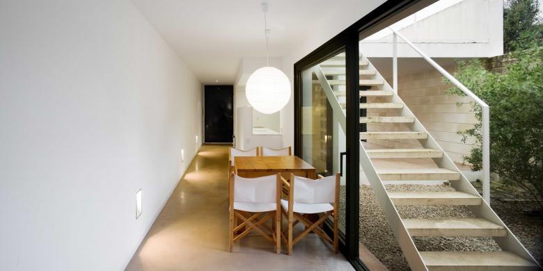 Der Neubau liegt in einem neu erschlossenen Randgebiet des Dorfes. Sein Volumen besetzt die gesamte Parzelle. Die Räume im Erdgeschoss sind um einen kleinen Patio gruppiert, der die Belüftung, die natürliche Belichtung und die Kommunikation zwischen den Nutzungen ermöglicht. Die Schlafräume sind, von der Strasse zurückversetzt, im Obergeschoss angeordnet. Die Aussenwand, die den Patio begrenzt, führt ins Wohnzimmer- und besteht aus einem ortstypischen Kalkstein.