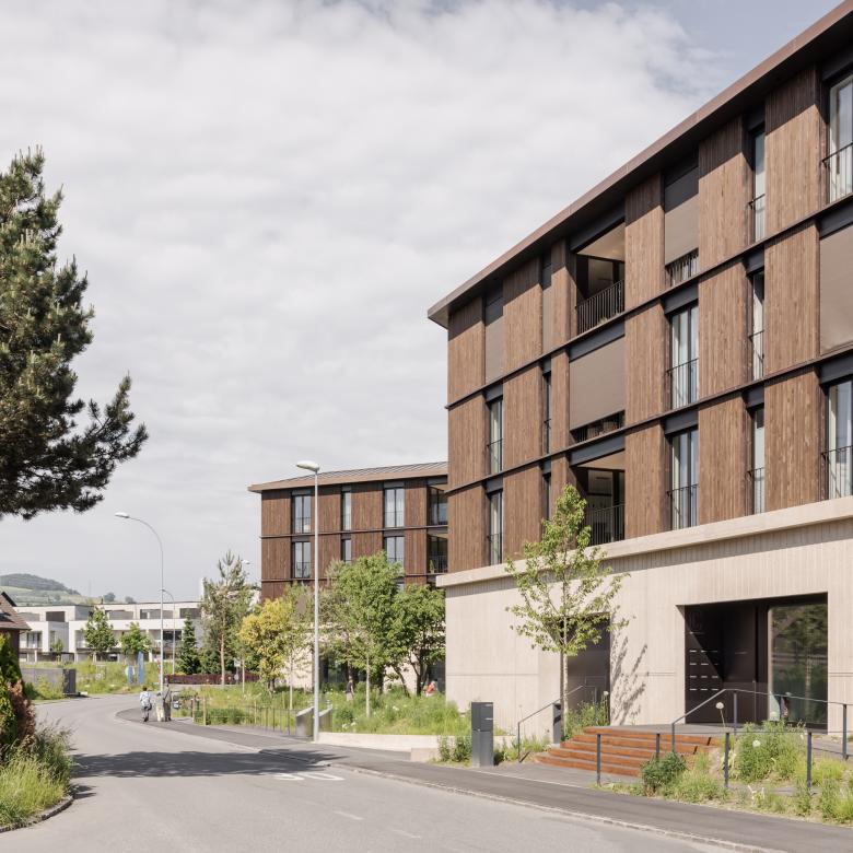 Das differenziert geformte Volumen bricht durch Rücksprünge und Einstülpungen die vermeintliche Grossform und fügt sich in die Massstäblichkeit der Umgebung ein. Ein zusammenhängendes „Zentrum“ wird geschaffen. Durch Knicke in der Gebäudeform öffnet sich der Baukörper in drei Richtungen und formt Plätze mit verschiedenen Qualitäten. Im öffentlich zugänglichen Erdgeschoss befinden sich Dienstleistungs- und Gewerbeflächen, das 1. bis 3. Obergeschoss ist der Wohnnutzung vorbehalten. Ausblicke in die Umgebung sowie Wohnungslayouts mit fliessendem Wohn- und Essbereich erzeugen ein Gefühl von Grosszügigkeit.