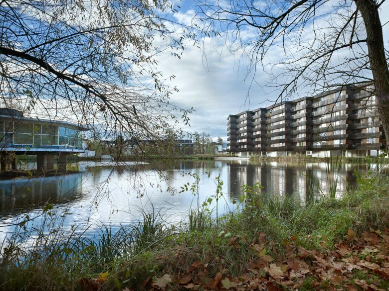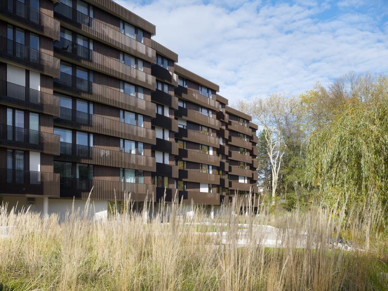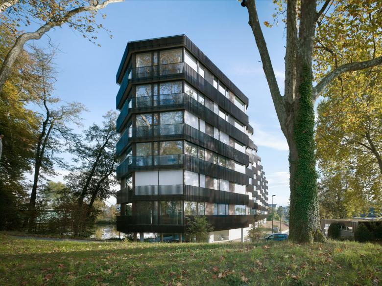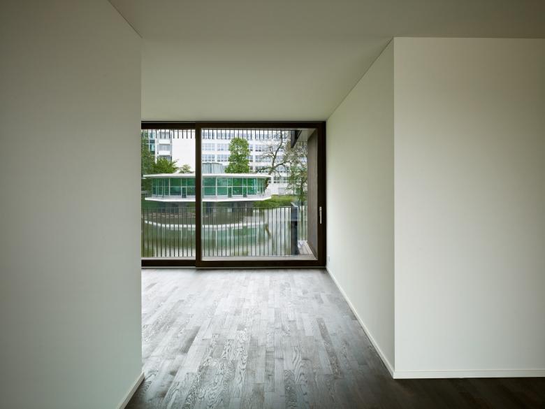 Mit der Öffnung des Zellweger-Luwa-Areals wird ein ehemaliger Industriestandort zum qualitätsvollen Wohnraum transformiert. Der 6-geschossige Bau umfasst 51 Eigentumswohnungen und liegt direkt am Herterweiher. Durch eine wellenartige Ausbildung wird die Rhythmisierung des Volumens erreicht. Das Treppenhaus und die Individualräume mit den Funktionsräumen sind in kompakten Sequenzen angeordnet, die Kollektivräume bilden grosszügige Raumfolgen. Die räumliche Kontinuität erscheint über die Klimagrenze hinaus in der auf Tiefenwirkung angelegten Loggiengeometrien fortgesetzt. Die parkartige Landschaft durchdringt den Baukörper und wird Teil der inneren Raumerfahrung.