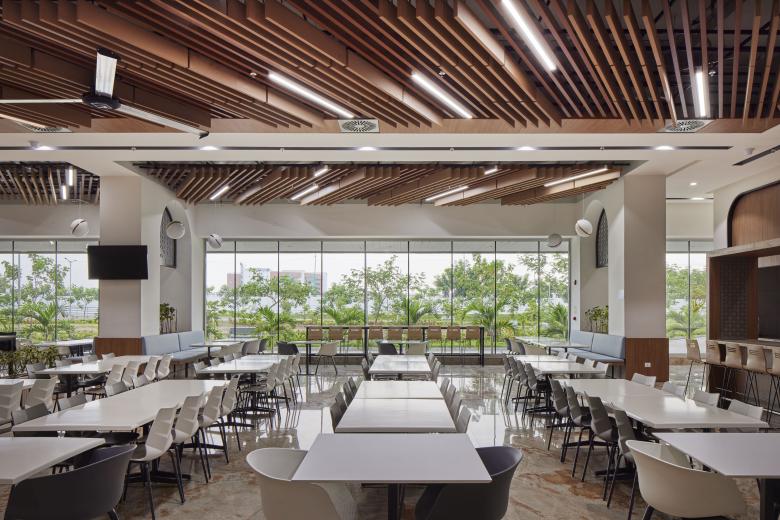 The utility zones are separated from the workplace, optimizing circulation patterns for various user groups. Parking layouts have been designed efficiently, and the strategic placement of service cores enables operations to be carried out smoothly without disrupting any workflows. This helps ensure a pedestrian-friendly campus. The low building height maintains proximity to the surrounding landscape, facilitating human-nature interaction.