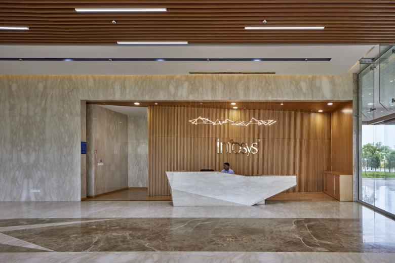 The perpendicular edges of the building feature monolithic concrete walls and are visualized as urban canvases. The 30m tall RCC walls showcase a ‘Zero-Mile Location’ contemporary illustration of Nagpur Fort on one end and a mind tree representative of Infosys’ work culture on the other. From the contemporary art depicted on the façade to the thematic artwork scattered throughout the interior spaces, every aspect of the campus reflects a celebration of regional identity and tradition.