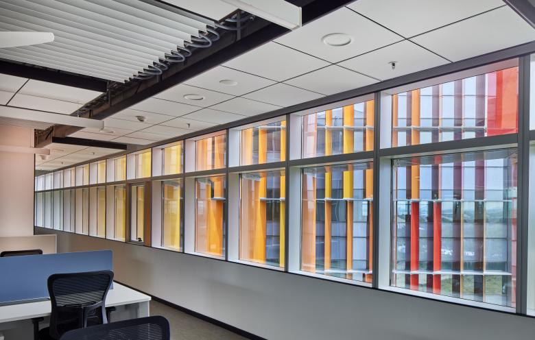 The fins’ configuration responds to the specific programme and is different for workspaces, break-out areas, and meeting spaces. A narrow 40-degree angle is employed for workspaces, whereas the fins open up to a wider, welcoming 60-degree angle in break-out spaces and meeting areas, granting ample views to the adjacent landscape. By decreasing the window-to-wall ratio, coupled with light shelves, glare on workstations is significantly reduced.