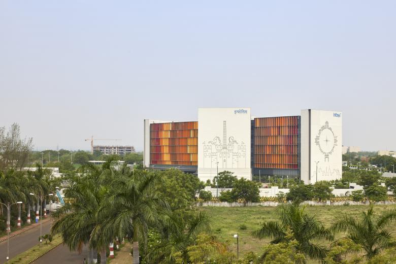 The building’s form and orientation played an integral role in achieving the numerous sustainability goals. It features a distinctive X-shaped plan, with each of the 100m long wings oriented at 22.5 degrees to the tropic of Cancer, and the central intersection forming the core. This intervention, long with limiting the depth of each floor plate to 18m, ensures that 90% of the workspaces receive ample daylight from both sides. The morphology also responds to programmatic requirements, establishing a central circulation node that brings together the Offshore Development Centres (ODC) located in the wings.
