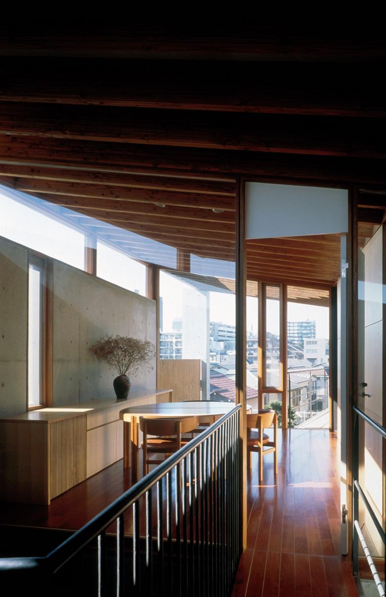 This house was planned on a high ground named Fujimidai in northwest Tokyo. The narrow, irregularly shaped site borders a 4-meter-wide road on the northeast and features a south-facing cliff approximately 3 meters lower than the adjacent property.