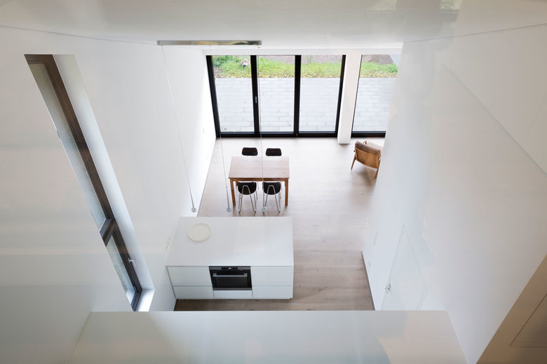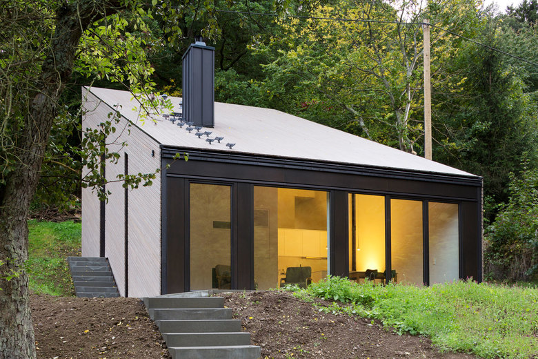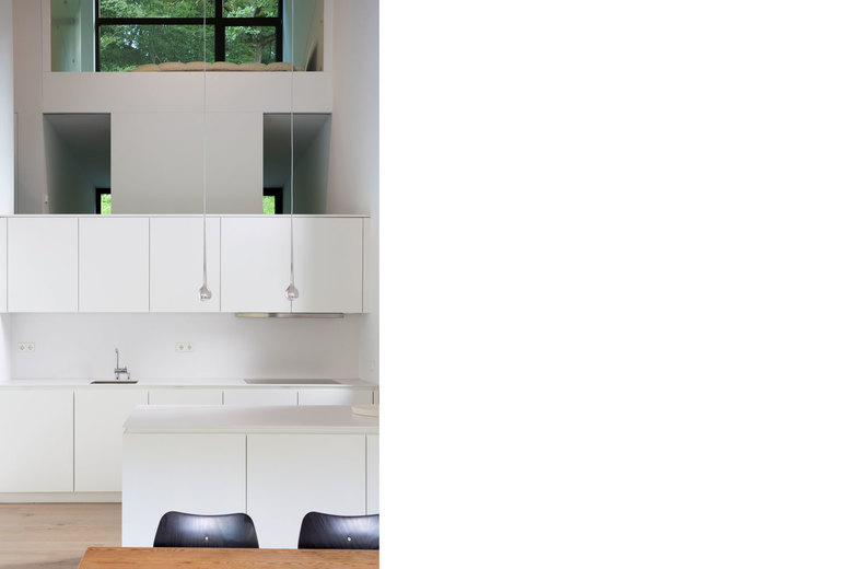 See- und Meuchelbergblick, Eichenwald und Nordhang sind die ersten Eindrücke, die es in ein „Wochenendhaus“ zu fassen gilt. Letztgenannter stellt hierbei vermeintlich die besondere, nahezu unlösbare Herausforderung dar. Liegt doch die Vermutung nahe, dass das Haus und seine zukünftigen Bewohner nur wenig von der Sonne profitieren werden. Bei genauer Betrachtung zeigt sich jedoch, dass insbesondere im Winter und den Übergangszeiten durch das fehlende Laub an den Bäumen die Sonne über den Berg hinweg durch die lichten Bäume den Weg auf das Grundstück findet. Hierin ist ein wesentlicher Entwurfsgedanke und schlussendlich die Form des Hauses begründet. Glaubt der externe Betrachter, dass das Haus falsch herum positioniert ist, da sich das Haus mit der hohen, transparenten Fassade nicht dem See zuwendet, so kann man selbst in Sommermonaten und um so mehr im Winter den Effekt erfahren, wie das Haus das über den Berg scheinende Sonnenlicht einfängt. Damit der gesamte Wohnraum des kleinen Hauses von diesem Effekt profitiert , gibt es viel Transparenz und Durchsicht, quasi den visuellen Eindruck eines Einraumhauses. Positiver Nebeneffekt ist es zudem, dass aus allen Räumen beide Qualitäten der Umgebung, Eichenwaldblick und Seeblick erfahren werden können. Aus der Hanglage und der Trichterform ergibt sich nahezu selbstverständlich die innere Organisation. Das Erdgeschoss wird über eine Split-Level- Aufteilung strukturiert und in die beiden Nutzungsbereiche Wohn-Koch-Ess-Bereich und Bad-Gäste-Arbeitsbereich unterteilt. In das Obergeschoss gelangt der Bewohner über eine Treppe mit unerwartetem Blick in den Eichenwald. Hier befinden sich eine zusätzlichen Nasszelle sowie der Schlafraum, der lediglich durch eine grosse Glasscheibe abgetrennt in unmittebaren Sichtkontakt mit dem übrigen Wohnraum steht.
