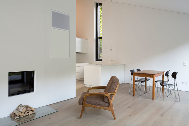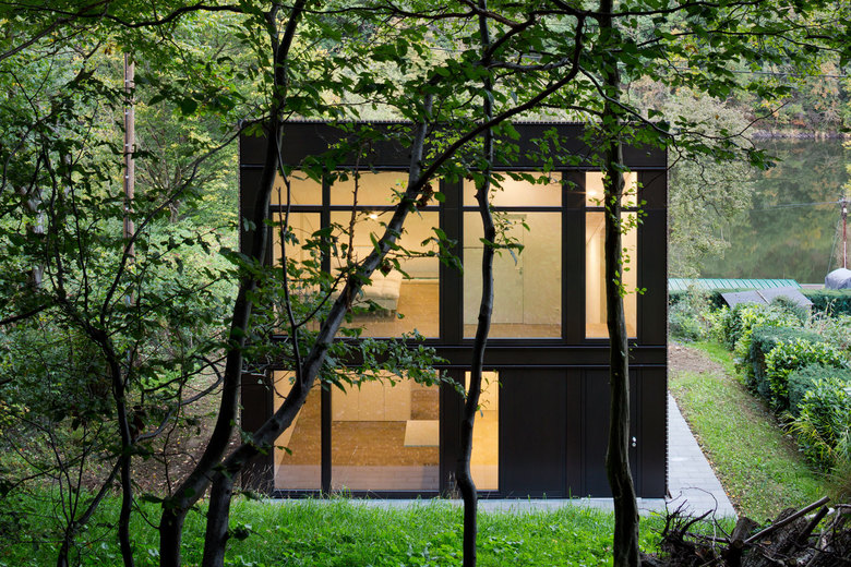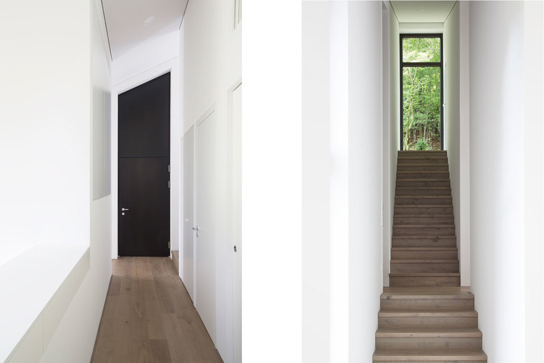 Der Baukörper, resultierend aus der Hanglage und dem Focus auf See und Eichenwald, wird als Einraum begriffen. Gleich einer Röhre verbindet er im Inneraum beide Eindrücke zugleich und wird so zum „Durchwohnraum“, der sich in der Aussenerscheinung durch die über das Dach geführte Fassadenbekleidung aus Lärchenholz und die deutlich abgesetzten Holzglaselemente manifestiert. Die Eingangstür sowie 2 Fensterschlitze nach Osten und Westen brechen das Prinzip und sind auch im Innenraum als bewusste Störung der grundlegenden Ausrichtung des Gebäudes erlebbar und werden zu besonderen Elementen ohne das Prinzip in Frage zustellen.
