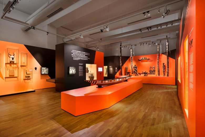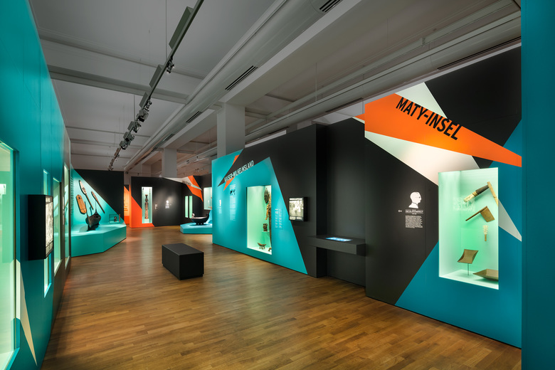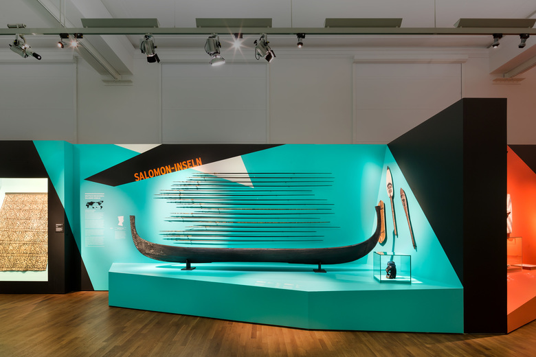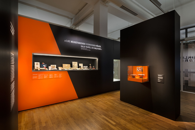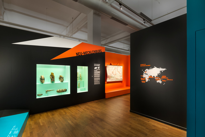 Der Prolog führt in das Fremdenbild, den Rassismus und die deutsche Kolonialzeit ein. Die grafische Gestaltung bezieht sich mit ausgeblichen dargestellten Farben auf die Flagge des Deutschen Reiches. Die zwei Ausstellungsbereiche Ozeanien und Afrika werden durch geografisch assoziative Türkisblau- und Rot-Töne voneinander abgegrenzt. Die deutschen Kolonialnamen dringen mit aggressiven schwarz-weiß-roten Keilen in diese Farbwelten ein.