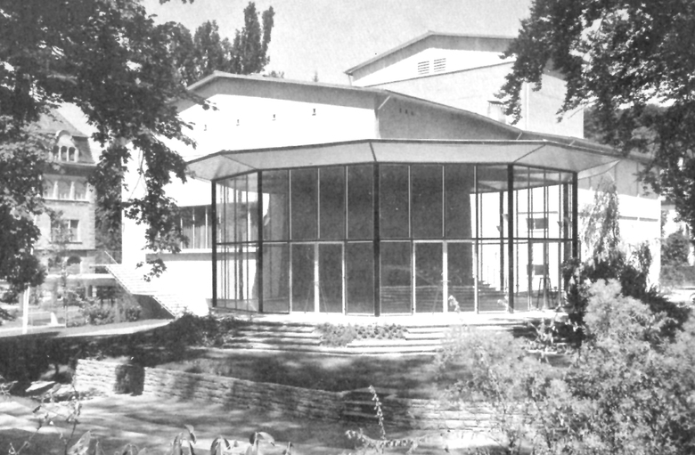 Der bedeutende Theaterbau im Kurpark von Baden wurde 1952 von der Architektin Lisbeth Sachs erbaut. Ihre Architektur verfolgte die im damaligen Fachdiskurs zentralen Themen wie das Brechen lokaler Symmetrien, die episodische Betrachtung von Räumen, das Einschreiben einer „promenade architecturale“ in den Baukörper oder auch das optimale Einbetten des Baukörpers in die Topografie.