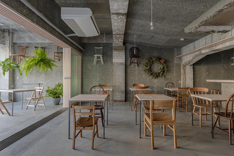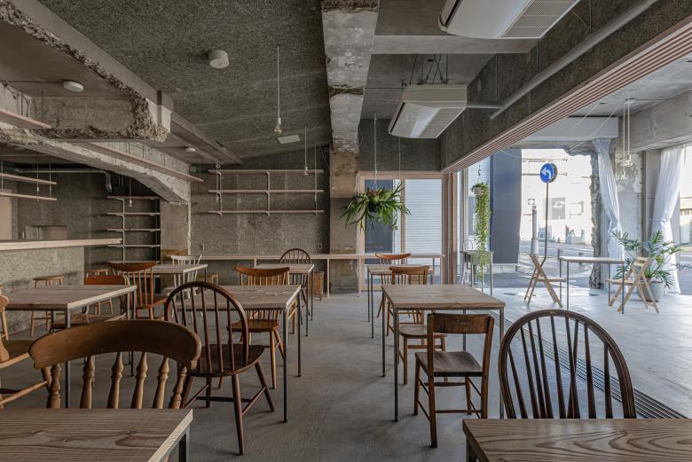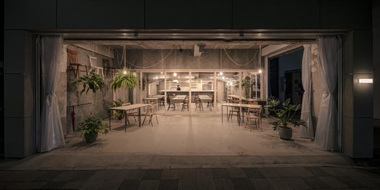 その空間の奥には完全に引き込める6枚の引き戸があり、引き戸を引き込むことによって店内すべてを外気空間に変化させることも可能となる。