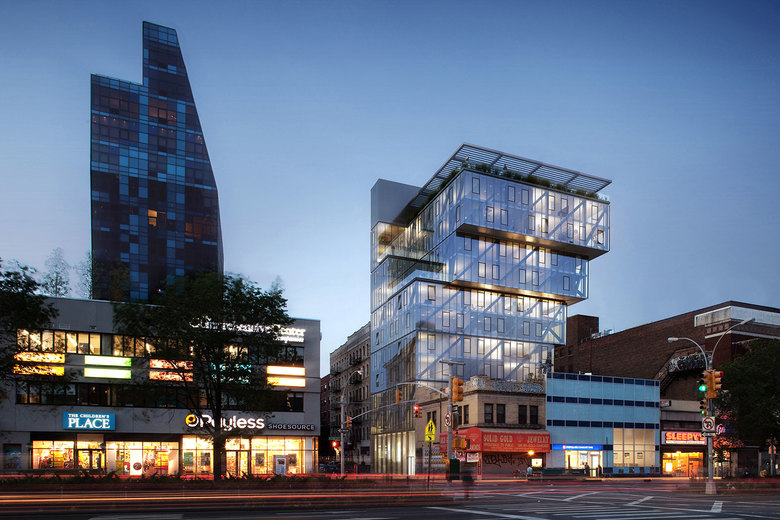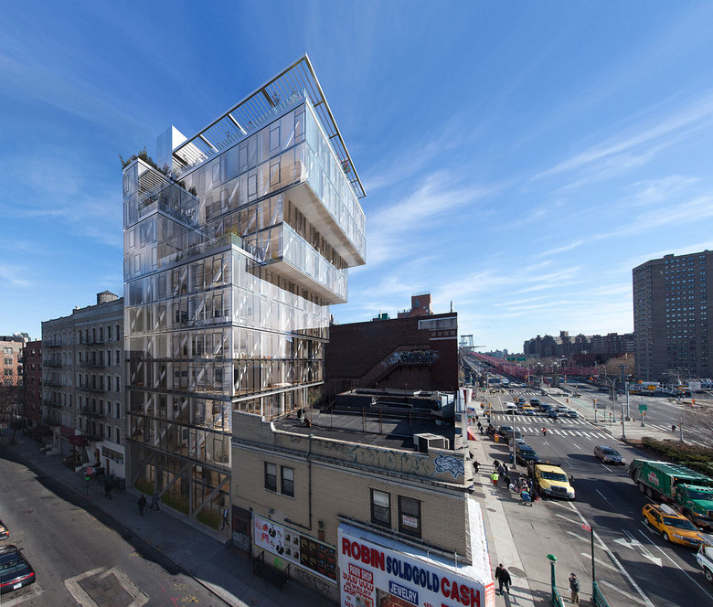 Located on the lower east side of Manhattan, 100 Norfolk expresses the potential and ambition hidden in the New York block. Rising from a small lot, the 12 story building is combining unused bulk from the surrounding properties to create a stepping volume that cantilevers over the adjacent low rise buildings like an upside-down “wedding cake." Higher than its neighbors, 100 Norfolk is a mid-block-freestanding building, operating like a corner lot structure with its strong light exposure for interior spaces and direct views of Downtown, Midtown and Williamsburg Bridge. The strict zoning height limitation forces the volume to depend on its cantilevering potential to maximize floor area towards the top of the building. This cantilevering freezes the height of the corner neighbor thereby softening the transition between block and street. 100 Norfolk stands as an archetype to new urban corner conditions.