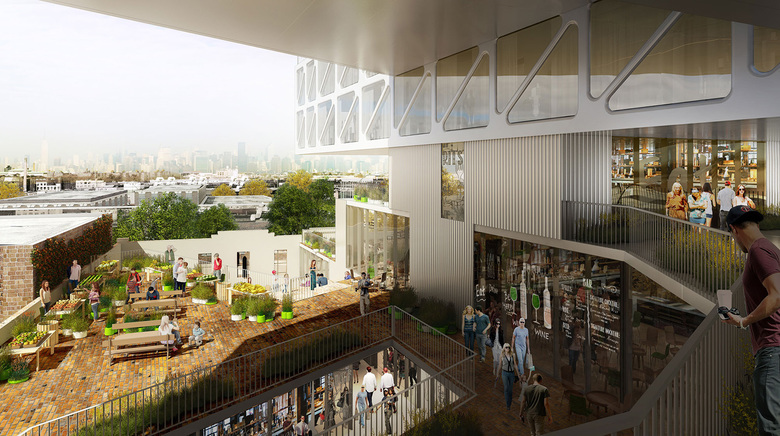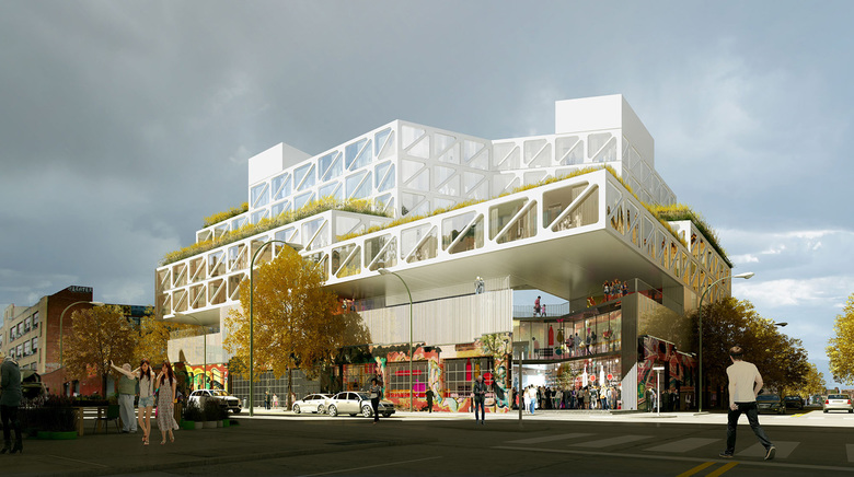 Emerging from the existing walls of a former 1930 manufacturing building, 71 White is a 100 key hotel cantilevering over an elevated market square. The lot borders East Williamsburg’s industrial blocks and Bushwick’s residential fabric. While centered between the two zonings, 71 White is two blocks away from the water source of Newtown Creek. Proximity to the creek’s water drew in companies such as Brooklyn Union Gas and Rheingold Brewery to set up their industrial infrastructures in the early 20th century. As years passed, factories closed down and migrated leaving behind many obsolete lots.
