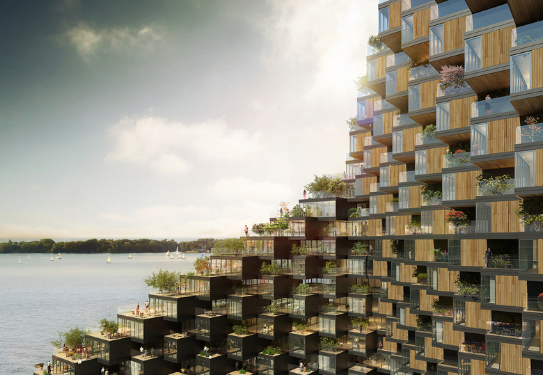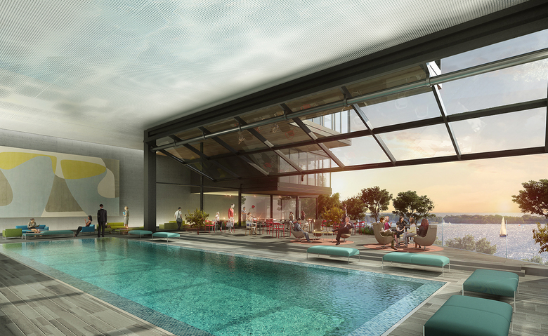 Interpreting these formal gestures into a clear and simple, contemporary architecture is a nonlinear task. Structural, mechanical, and spatial necessities constrict the breadth of formal movement yet provide opportunity for innovative interpretation. Efficiency and formal desirability is achieved by rotating, staggering, and tilting these parameters toward the waterfront within module dimensions. Employing these manipulations, the building creates 211 apartments with terrace space (97%) totaling to 68,550 square feet and 163 units with water views (71%).