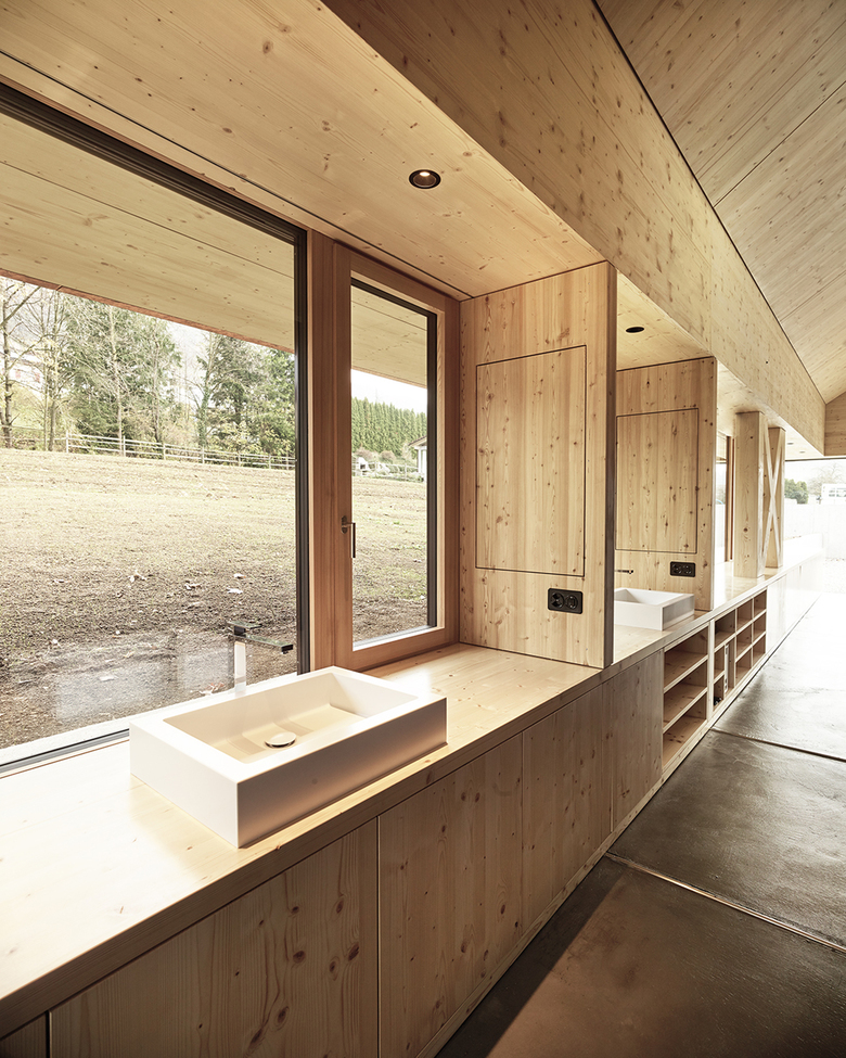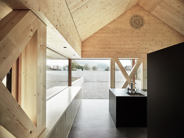 Die von innen als auch von aussen, gut ablesbar, nachvollziehbare, wenn auch reduzierte Konstruktion erschliesst sich sowohl dem Bewohner als auch dem Betrachter. Es entsteht eine moderne Interpretation und Weiterentwicklung, der im Ort vorhandenen Gebäude und zeigt prägnant und charakterbildend die Möglichkeiten des heutigen Holzbaus auch im privaten Wohnen auf.