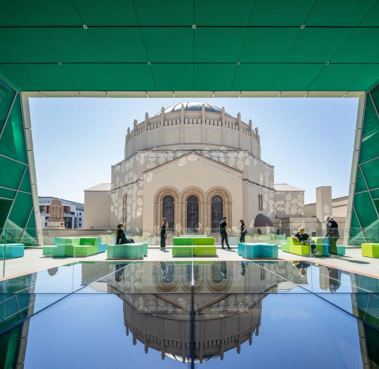 At the ground level, the main event space echoes the temple dome by lowering the arc and extruding it north across the site to connect Wilshire Boulevard to the school courtyard. In its full length, the vaulted, column-free expanse has the capacity to host diverse programs such as banquets, markets, conventions, performances, and art events. An oculus provides a view through the void above to the dome of the historic temple.