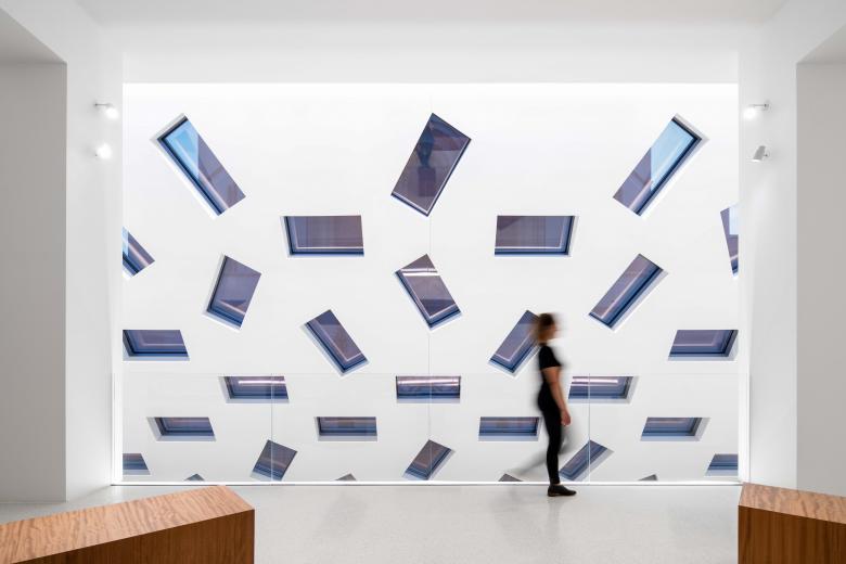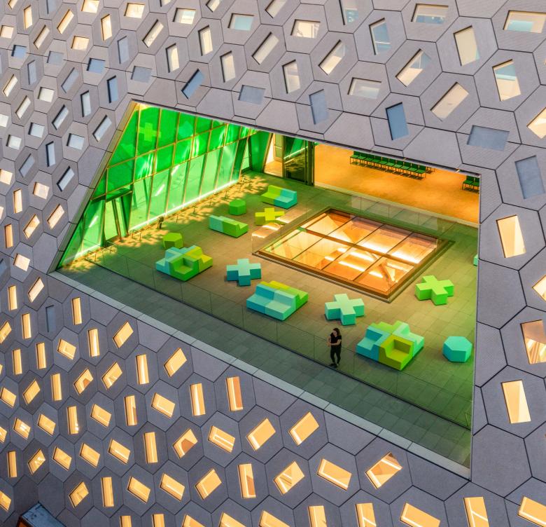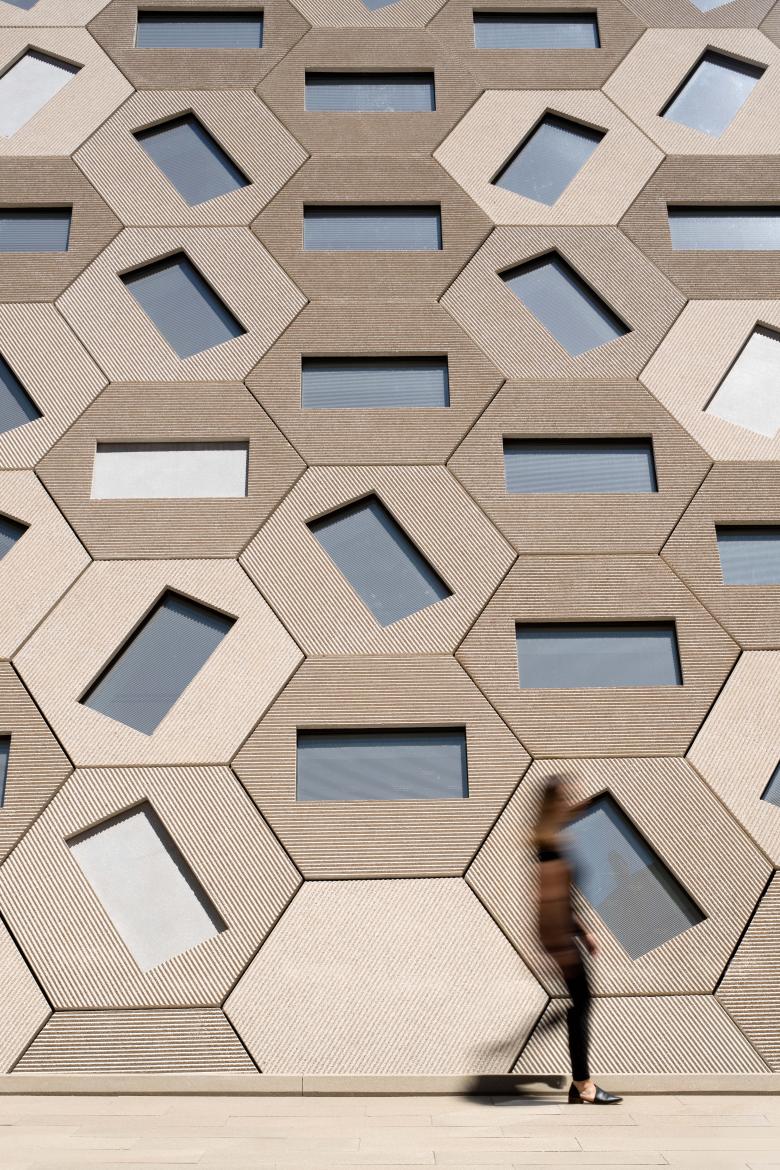 The facade draws from the geometries of the temple’s dome interior. A single hexagon unit with a rectangular window is rotated to reflect the program within and aggregated to create a distinct pattern. The panels enhance the building’s volumetric character while adding a human-scaled texture that breaks down its mass.