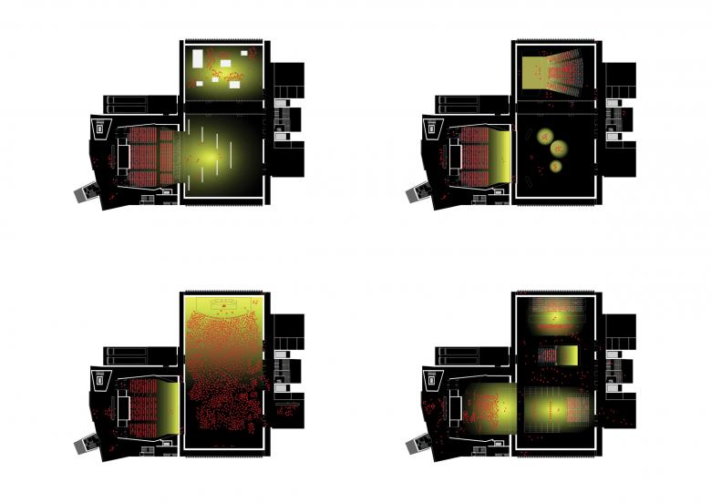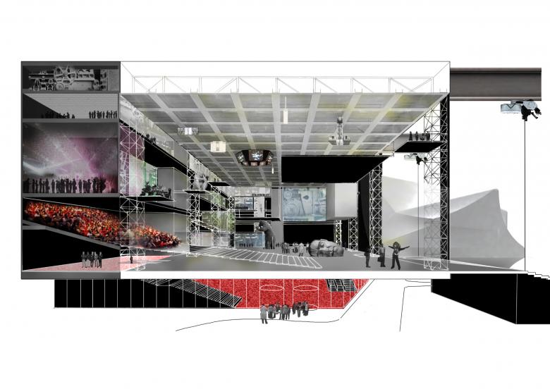 The Factory is not one building but two. Its main event space, the Warehouse, is one large, 21-meter tall, flexible container, left bare to be adapted by its users as they see fit. It can be used as a single space or subdivided in two, with full-height moveable partitions that provide acoustic insulation. Productions of different scales can take place inside, from intimate performances to concerts with 5,000 people standing. The ceiling is a technical grid, with lighting, equipment and rigging, that supports concerts and exhibitions alike.