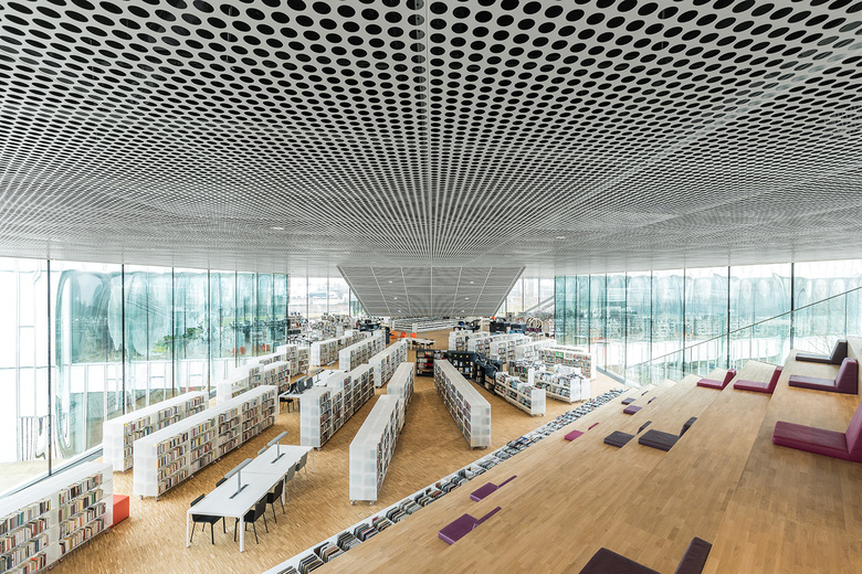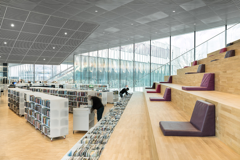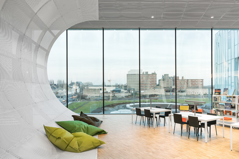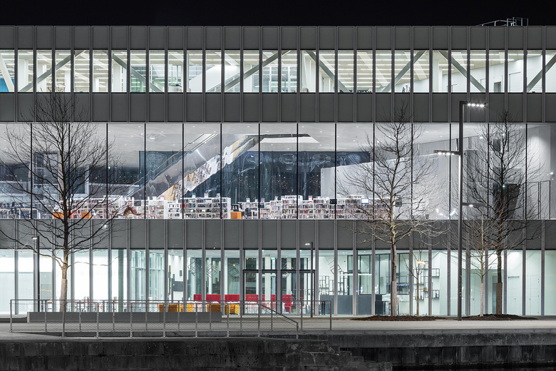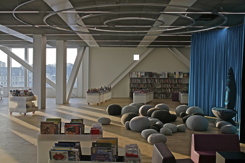 Bibliothèque Alexis de Tocqueville is a public library for the metropolitan region Caen la Mer in Normandy, France. The 12,000 m2 multimedia library is located at the tip of the peninsula that extends out from the city of Caen to the English Channel. Its key position – between the city’s historic core and an area of Caen that is being developed – supports the city’s ambition for the library to become a new civic center. The library’s glass facade visually connects the adjacent park, pedestrian pathway and waterfront plaza to the interior and together with two large ground floor entrances at both sides of the building, enables a fluid interaction of the library with its surroundings. On the upper floors, the urban belvedere provides unobstructed views in all four directions.