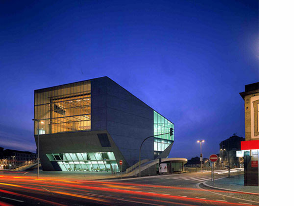 Architectural concept – Most cultural institutions serve only part of a population. A majority knows their exterior shape, only a minority knows what happens inside. OMA addressed the relationship between the Concert Hall and the public inside as well as outside the building by considering the building as a solid mass from which were eliminated the two shoe-box-shaped concert halls and all other public program creating a hollowed out block. The building reveals its contents to the city without being didactic; at the same time the city is exposed to the public inside in a way that has never happened before. The “remaining spaces‟‟ between the exposed public functions consist of secondary serving spaces such as foyers, a restaurant, terraces, technical spaces and vertical transport. A continuous public route connects all public functions and “remaining spaces” located around the Grand Auditorium by means of stairs, platforms and escalators: the building becomes an architectural adventure. The loop creates the possibility to use the building for festivals with simultaneous performances; the House of Music. The building provides a large amount of rehearsal rooms, soloist rooms and dressing rooms to house the Porto Philharmonic Orchestra and to provide in addition facilities to external and guest performers. During the Design Phase OMA researched new materials and new applications of existing and Portuguese materials exclusively for Casa da Musica such as; the corrugated glass for the windows of the Auditoria, the used tiles for different rooms and the chairs, canopy and wall finish in the Grand Auditorium.