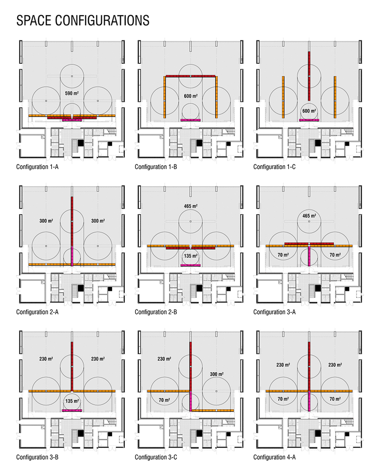 Interior design – The design for the interior introduces a flexible floor plan to accommodate the required program diversity. Four 8.10 m pivoting and sliding walls can create multiple space configurations depending on the type of event. To maintain a fluid space, all the major interior equipment has been integrated into the ceiling, leaving the walls and floors free of any components. Two linear skylights have been positioned above the movable walls to allow either thin blades of light or full daylight depending on the configuration.