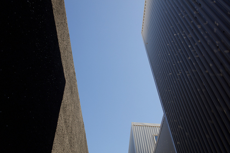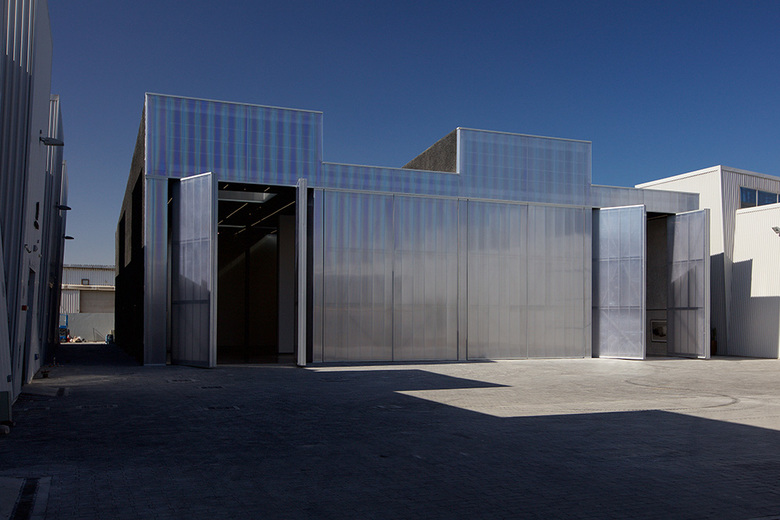 Exterior design – The original front façade of the ware-house has been replaced with poly-carbonate cladding and full height operable doors. When the doors are open, the exterior and interior space can merge, activating the courtyard. The connection to the exterior is reinforced by the translucent poly-carbonate, which brings the view, daylight and outdoor activities into the interior space. The rest of the original façade has been maintained and sprayed in a customized mix of concrete with glass and mirror aggregates. The rough texture of the spayed concrete and reflections from the glass and mirror aggregates will make the venue stand out in the context of Alserkal Avenue.
