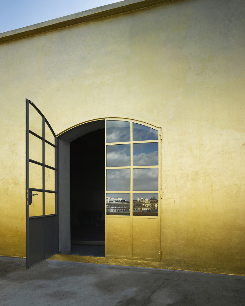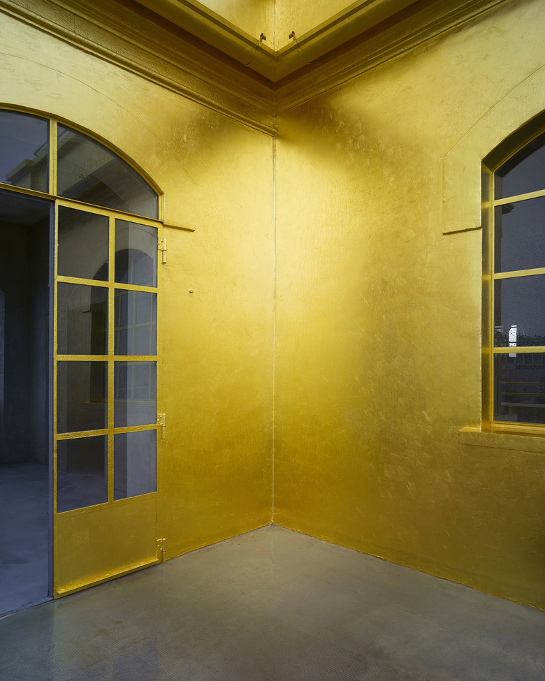 Four 'houses' that face the courtyard to the north and an abandoned garden to the south accommodate Fondazione offices and permanent galleries. Within their confines sits the ‘Haunted House’, an existing building with its exterior covered entirely in gold leaf. Inside, the intimate scale of its interiors generates a ‘domestic’ setting for specific works.