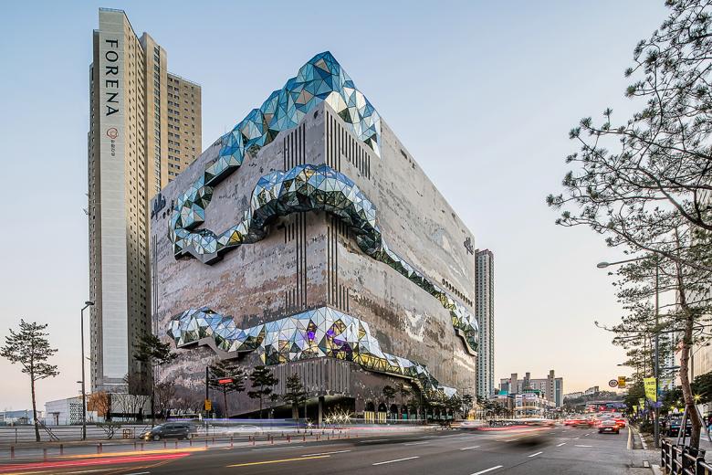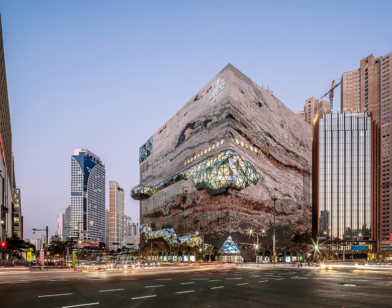 The store is located between the Suwon Gwanggyo Lake Park and ubiquitous buildings in the city: an intersection between nature and the urban environment. The store has a textured mosaic stone façade that evokes nature of the neighbouring park. Appearing as a sculpted stone emerging from the ground, the store is a visual anchor in the city.