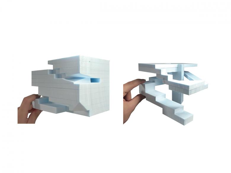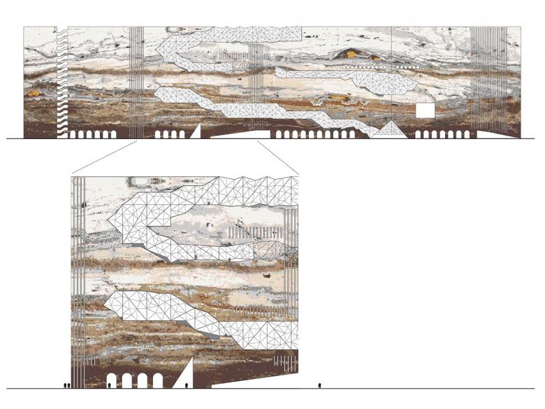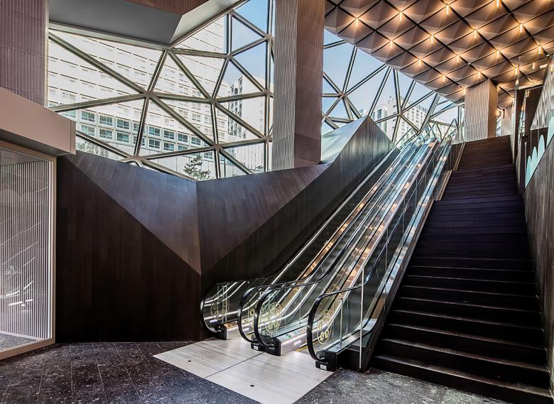 The public route has a multifaceted glass façade that contrasts with the opacity of the stone. Through the glass, retail and cultural activities inside are revealed to the city’s passers-by, while visitors in the interior acquire new vantage points to experience Gwanggyo. Formed with a sequence of cascading terraces, the public loop offers spaces for exhibitions and performances.