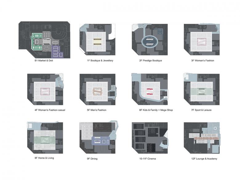 The Galleria is Korea’s first and largest upscale department store franchise founded in the 1970s, and has remained at the forefront of the premium retail market in the country since then. The store in Gwanggyo—a new town just south of Seoul—is the sixth branch of Galleria. Located at the center of this young urban development surrounded by tall residential towers, the Galleria’s stone-like appearance makes it a natural point of gravity for public life in Gwanggyo.