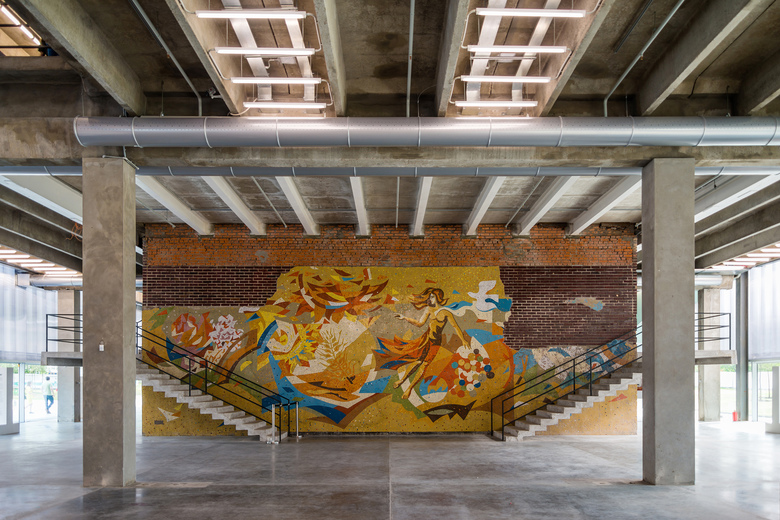 Exposed to snow, rain, and sun since it was abandoned in the 1990s, the former Vremena Goda restaurant – once a popular destination in Gorky Park – has become a ruin without facades. Even as a ruin it preserves the "collective" aura of the Soviet era: it is a sober public space adorned with tiles, mosaics and bricks.