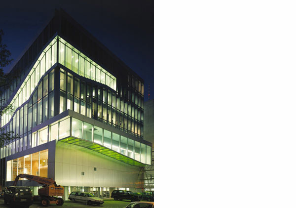 From the entrance, the trajectory of the path leads to the library, on to the meeting rooms, skirting the offices, leading up to the fitness area and finally the restaurant on the roof terrace. This trajectory also distributes fresh air drawn from the double plenum façade to the work spaces (the areas that the path has carved out of the cube). At one point the path escapes the constraints of the cube and cantilevers over the courtyard. The regularity of the cube's glass and steel facade is disturbed again at moments where the path grazes the exterior, making itself visible from the outside and providing strategic views of the Spree, and the television tower.