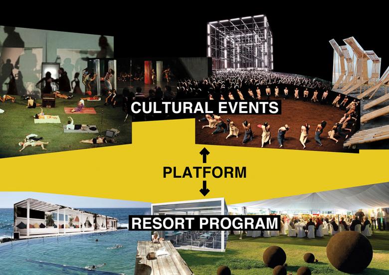 In the Potato Head Studios, a floating ring lifted by pilotis accommodates the private guest rooms and other functions, including an exhibition space and a sunset bar. This has resulted in an open cultural ground plane—or an open platform—which leads to the beach. This is a flexible stage for a range of programs, such as festival celebrations, cultural events, and day-to-day leisure activities that welcomes everyone to experience Balinese contemporary culture. At the roof top is a sculptural park open to public, accessible via a public route that connects amenity spaces including restaurants, pools, and spas.