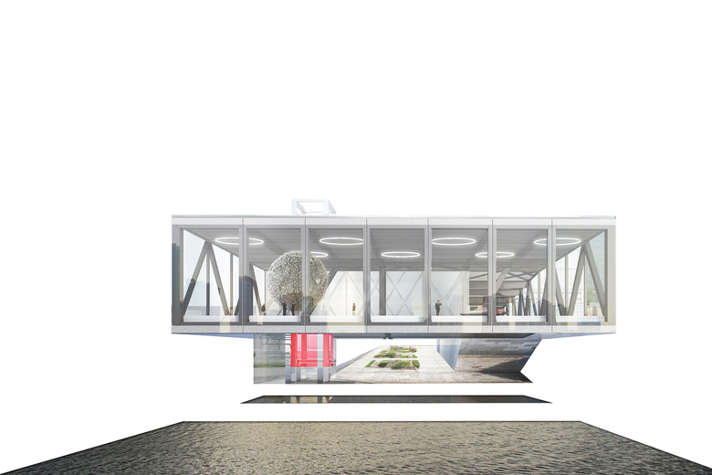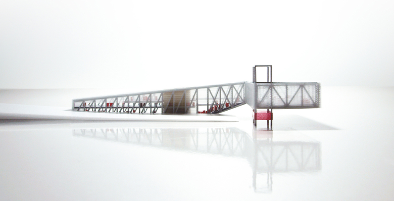 OMA conceived the Exhibition Centre as a “spatial armature,” suspended above a plaza and connected to another exhibition space beneath the ramp. The building organizes the open space, adding new programmatic opportunities for film screenings, fashion shows, and concerts. The new volume transforms the existing ramp into a large-scale theatrical space for events while the covered plaza under the elevated box can be used for more intimate happenings.