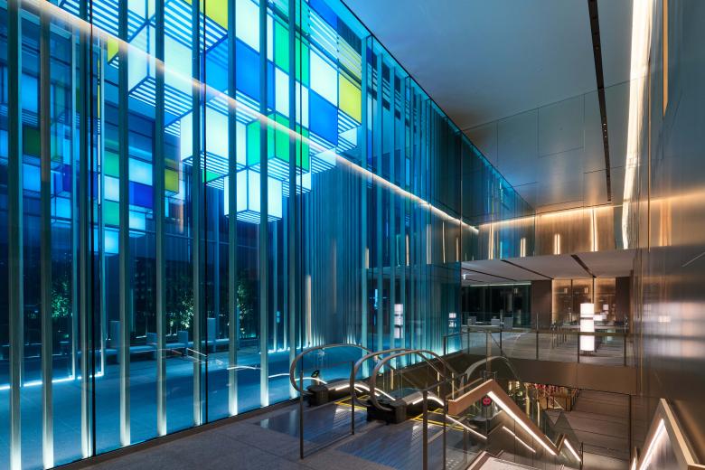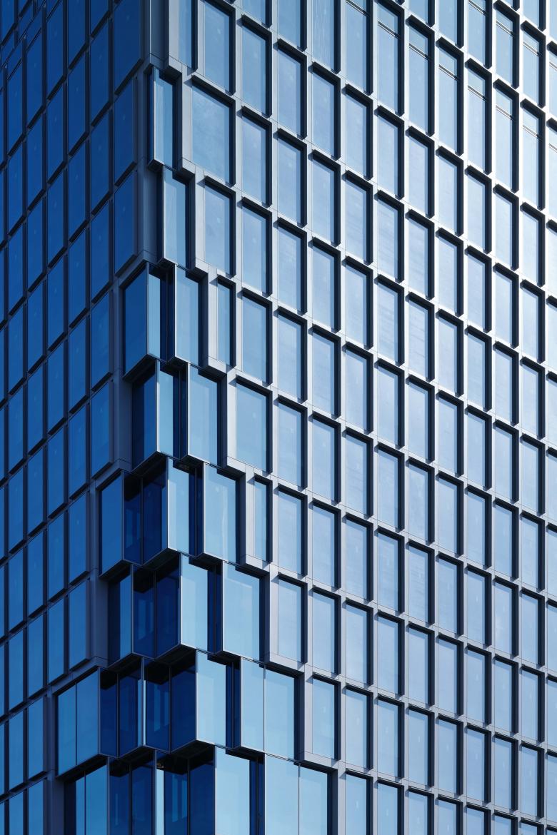 Within the carved out corner is a six-story atrium that reinforces the inside/outside visual connection and draws natural light down to the lower-level concourse linked to the area’s underground pedestrian, retail, and transit network. The excavation is calibrated as three-dimensional pixels that break down the building to a human scale. The pixelated facade forms a series of soffit surfaces above, activated with signage and lighting that reinforce a sense of place at the convergence point.
