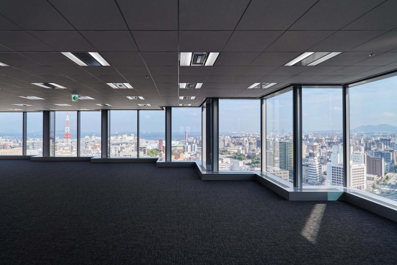 Setbacks at the opposing upper level provide green terraces for offices. In respect to the nature in the city, we symbolically introduce terraces with panoramic views to the often-overlooked Naka River and Hakata Bay. Together, the two pixelated edges round out the building to create a sense of softness like that of a melting ice cube.