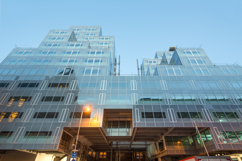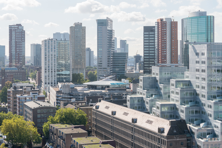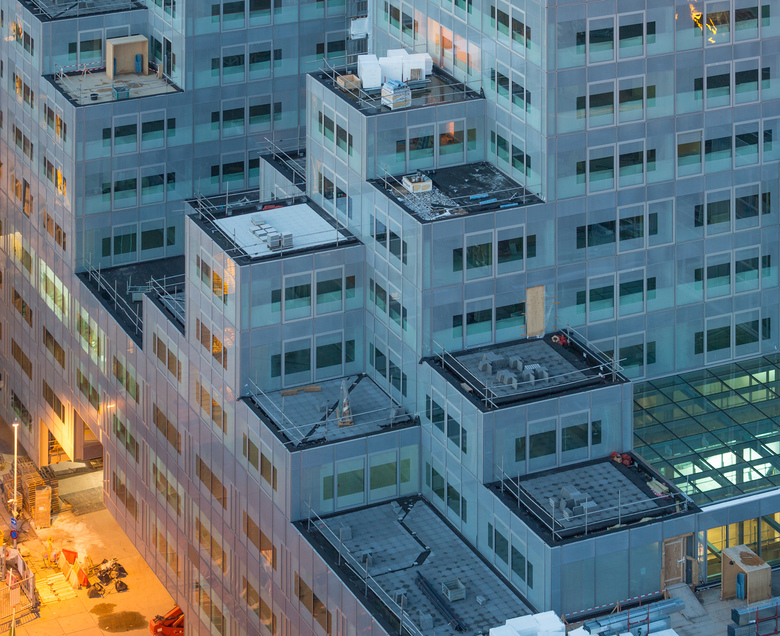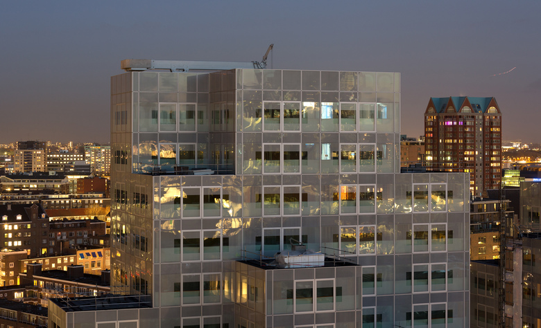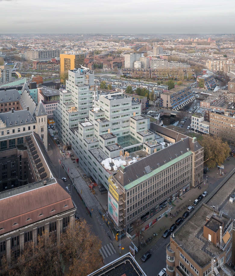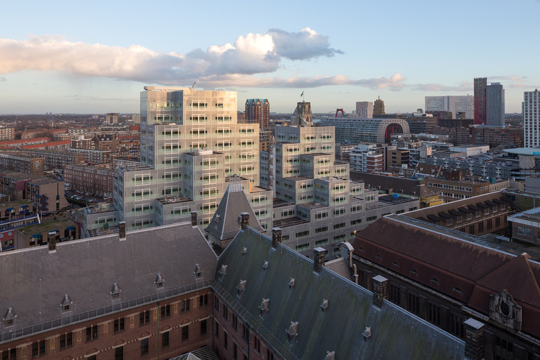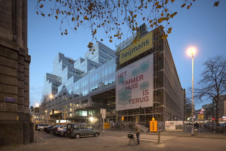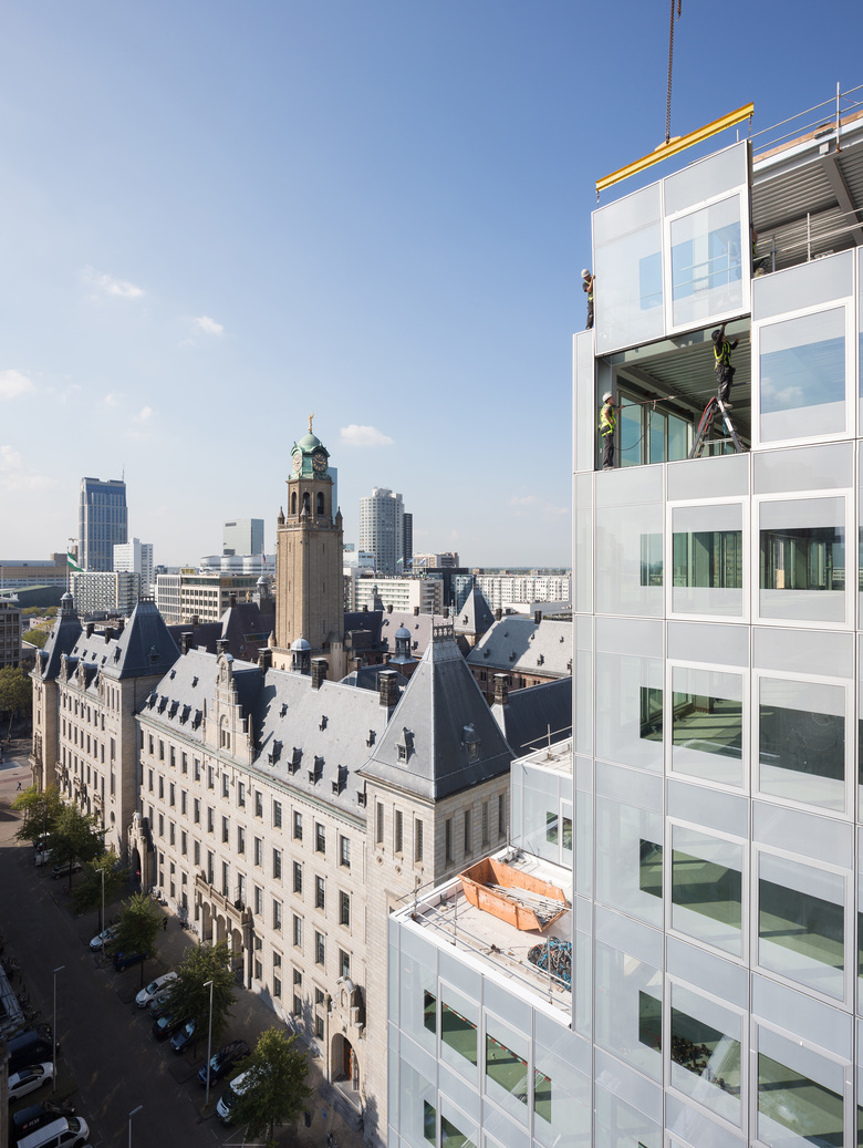 For Rotterdam's Timmerhuis, a new building for the city hall that will accommodate municipal services, offices, and residential units, OMA conceived a modular building with repeated units gradually set back from the street as they rise into two irregular peaks. The building's composition of smaller cells creates an impressive, complex form when viewed from Coolsingel, one of Rotterdam’s main arteries, and allows for subtlety and adaptability as the new building meets the Stadstimmerhuis (a municipal building, from 1953), which surrounds it on two sides.