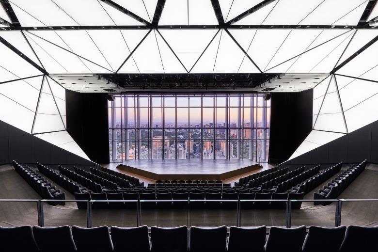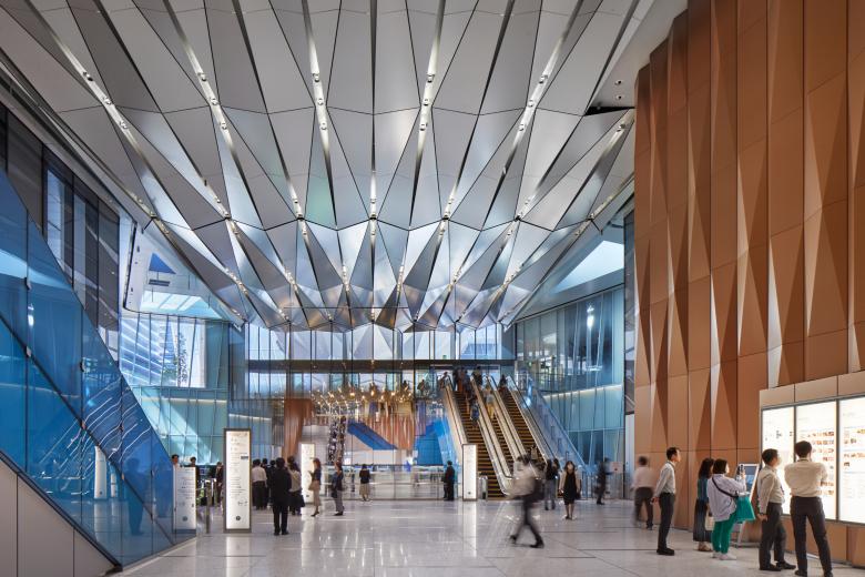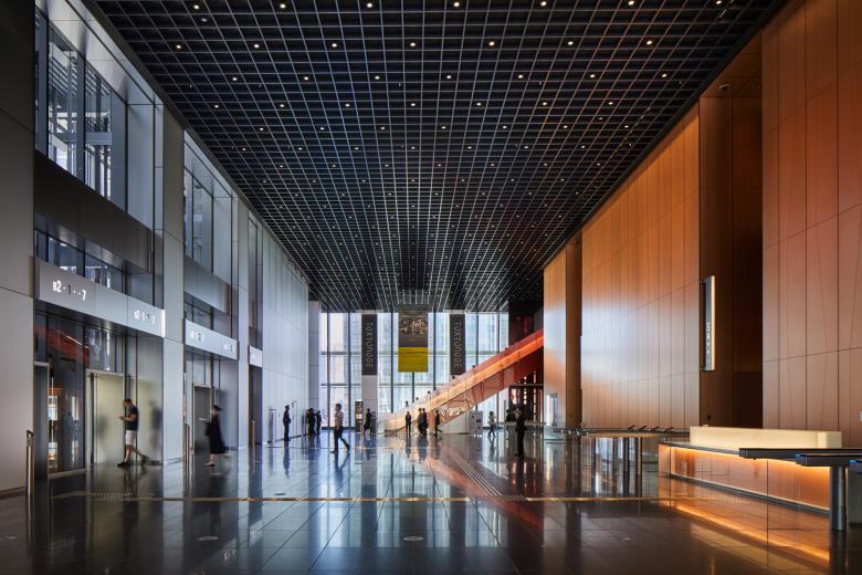 The bridge sectionally divides the base into two retail zones. The lower zone“the Station Atrium” provides direct access to the new Hibiya Line subway station (Toranomon Hills Station), connecting the tower to the greater region. Within, a grand atrium and subway station concourse flooded with natural light, the first of its kind in Tokyo, provides an exciting sense of arrival.