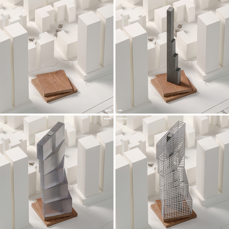 OMA’s design consists of five residential blocks forming a stepped sequence, which modulates from a L-shaped volume to slab. This structure maximizes occupancy on the lower floors and optimizes views along the vertical axis of the building. The apartment blocks offer views on both the seafront and the city and are connected by an exposed, monolithic core.