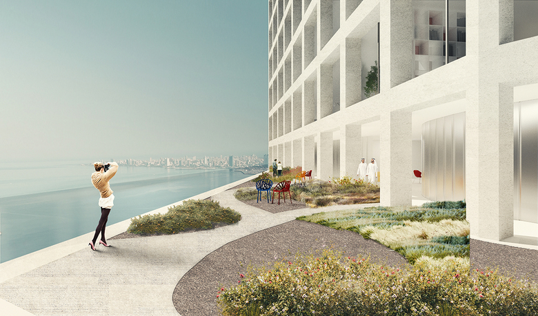 The emblematic stepped blocks generate lush terraces that provide space for sports amenities, a swimming pool and diwaniyas. The façade is marked by a rational, rectangular grid that enhances the visual effect of the skewed volumes of the tower blocks. On street level, the plinth accommodates a raised lobby with lounge areas and co-working spaces with seaside views.