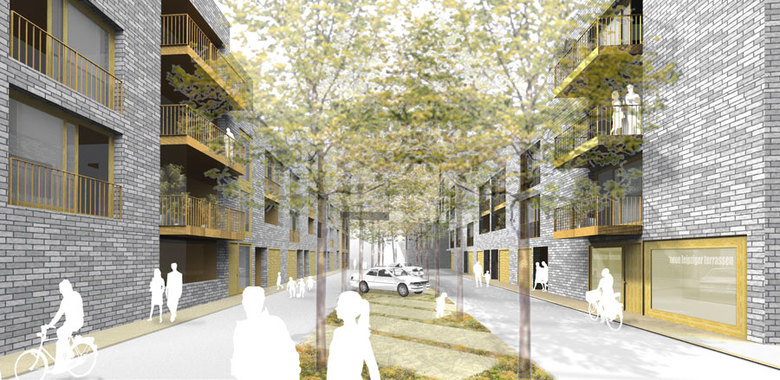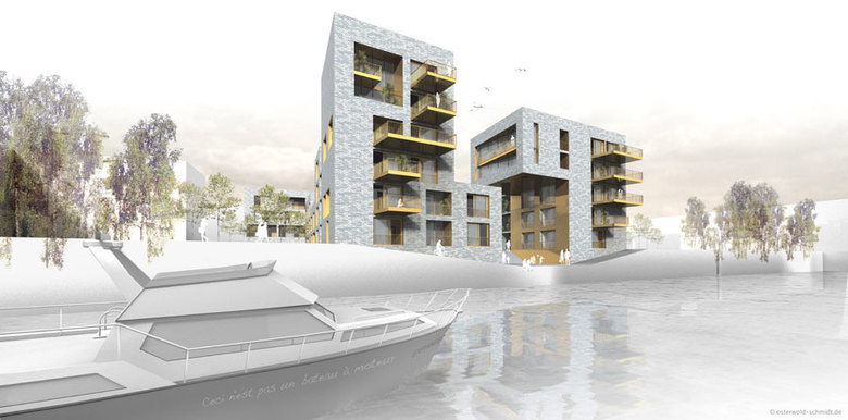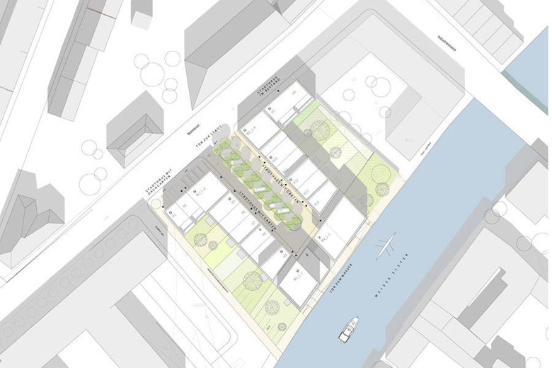 Das Potential eines Wassergrundstückes in der Großstadt wird als Leitmotiv für die neue Bebauung begriffen. In Beachtung der umstehenden zu Wohnzwecken umgenutzten Denkmale in einstiger Industriestruktur sowie neuer Wohngebäude wird eine Wohnbebauung entwickelt, die einen grosszügigen Bezug zur Weißen Elster herstellt. Die Typologie der „Terrassen“ als innerquartierliche Erschließung in Großstädten (z.B. Hamburg-Falkenried) ermöglicht hier eine effektive und konzentrierte Erreichbarkeit der neuen Häuser und mündet gleichermaßen in der direkten Übersetzung als Terrasse mit partieller Absenkung der Kaimauer. Die städtebauliche Mäanderform der Neubebauung wird baulich getrennt, so dass hier sowohl das Tor zur Stadt als auch das Tor zum Wasser mit baulicher Höhe formuliert wird und gleichermaßen eine bauliche Realisierung in Abschnitten gegeben wird. Dabei kann der Bestand an der Nonnenstraße unkompliziert in die neue Gebäudefigur einbezogen werden (selbst eine evtl. Fortführung des nachbarlichen Eckgrundstückes ist denkbar). Die neue Bebauung wird in einer Kombination aus ca. 15 Stadthäusern und 20-25 Eigentumswohnungen gesehen, die in Variationen mit Gartengrundstück, Dachgarten und im Bezug zum Fluss angeboten werden. Die interne Erschließungsstraße bildet hierbei einen halböffentlichen Freiraum für die Anwohner mit Zusatzangeboten zur Parkierung (Stadthäuser mit Garage). Auf diese Weise bleiben die Gartengrundstücke rein privater und geschützter Nutzung vorbehalten, die die unverbaubare Sicht zum Wasser gewährleisten. Häuser und Wohnungen sind mit großzügigen Loggien, Dachgärten und Balkonen über dem Wasser ausgestattet. Die vorgeschlagene überwiegende Verklinkerung der Gebäude schafft ortstypischen Bezug und langfristige Wertigkeit.