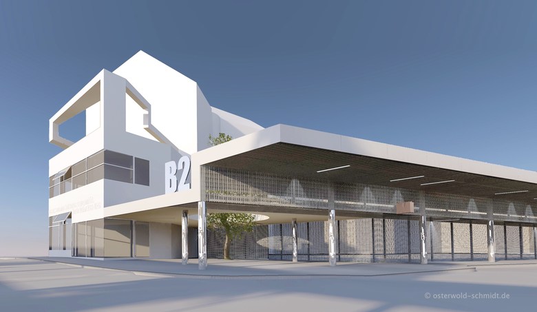 Die Konstruktion wird als Stahlkonstruktion gefertigt, die mit hell beschichteten Aluminiumtafeln verkleidet wird. Die Bereiche unter den Überdachungen werden in farbgleich beschichtetem Streckmetall als transluzenten Material vorgesehen.
