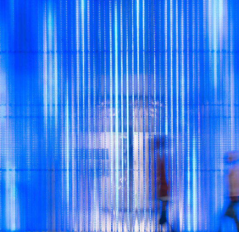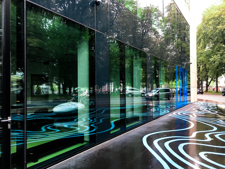 Neugestaltung der ehemaligen Empfangshalle der LEW Zentrale zum Kundenzentrum mit Energiewelt und Espressobar. Eine Textur mit blauen Wellenlinien und überdimensionalen Flusskieseln auf dem Vorplatz des Gebäudes symbolisieren den Lech als Energielieferanten des Konzerns. Ein Monumentalportal aus gelaserten Blechen führt auf einen virtuellen Wasserfall aus illuminierten Doppelstegplatten.