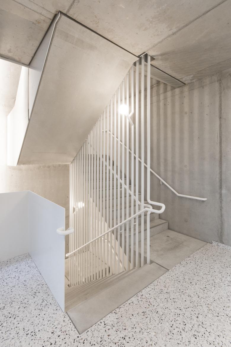 Die optisch zweigeschossige Arkadenzone verleiht dem Gebäude eine harmonische Proportion und bildet mit ihrem fußgängerfreundlichen Charakter und der Einbindung des Fitness-Studios ein Pendant zum gegenüberliegenden Supermarkt.